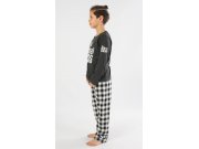 Dječja duga pidžama Actual boss - dječačka. Dječja pidžama se sastoji od majice s dugim rukavima i dugih hlača. Na majici je veliki natpis The Actual Boss. Karirane hlače imaju u struku gumu i vezicu za stezanje, nemaju džepove. Korišteni materijal je ugodan i mekan na dodir. Sadržaj pamuka u hlačama je 100%, a u majici 70%.