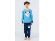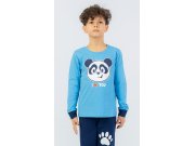 Dječja pamučna duga pidžama I love you. Dječja pidžama se sastoji od majice s dugim rukavima i dugih hlača. Na jednobojnoj majici nalazi se velika glava pande i natpis I love you. Na jednobojnim hlačama, koje završavaju manžetama, nalazi se otisak pandine šape. Hlače imaju elastičnu traku u struku, nemaju džepove. Korišteni pamučni materijal je ugodan i mekan na dodir.
