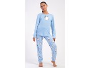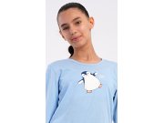 Dječja pamučna duga pidžama Pingvin. Djevojačka pidžama sastoji se od majice s dugim rukavima i dugih hlača. Majica s okruglim izrezom ukrašena je slikom pingvina. Ovaj motiv se ponavlja i na hlačama, koje u struku imaju gumu i vezicu za stezanje, nemaju džepove. Korišteni pamučni materijal je mekan i ugodan na dodir.