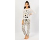 Dječja duga pidžama Sunny days. Dječja pidžama sastoji se od majice s dugim rukavima i dugih hlača. Na majici, koja je poput dukserice, nalazi se velika slika psa i mačke s natpisom Sunny days. Majica na donjem dijelu ima gumicu sa špagicom za stezanje. Motiv psa i mačke ponavlja se i na dugim hlačama koje završavaju rubom. Hlače u struku imaju gumu i špagicu za stezanje, nemaju džepove. Korišteni materijal s udjelom pamuka 70% je ugodan i mekan na dodir.