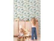 Flis tapeta s vinilnom površinom, bijela podloga, motiv oblačića u nijansama zelene, plave, tirkizne i oker boje, zrnasta tekstura. Što će vas oduševiti: visoka otpornost i perivost. Dizajn: dječji.