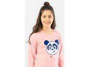 Dječja pamučna pidžama duga Alenka. Dječja pidžama sastoji se od majice s dugim rukavima i dugih hlača. Na jednobojnoj majici nalazi se velika glava pande i natpis I love you. Na jednobojnim hlačama, koje završavaju manžetama, nalazi se otisak pandine šape. Hlače imaju elastičnu traku u struku, nemaju džepove. Korišteni pamučni materijal je ugodan i mekan na dodir.