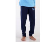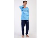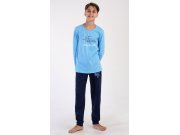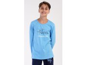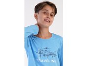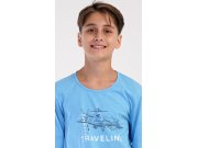 Dječja dječačka pamučna pidžama Avion. Pidžama se sastoji od majice s dugim rukavima i dugih hlača. Majicu s okruglim izrezom krasi slika aviona i natpis Traveling forward. Jednobojne duge hlače imaju elastičnu traku u struku i završavaju s rubovima. Korišteni pamučni materijal je ugodan i mekan na dodir.
