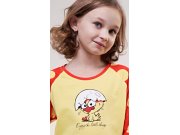 Dječja pamučna pidžama duga Mala pilić. Pidžama se sastoji od majice s dugim rukavima i dugih hlača. Na majici je slika slatkog pilića s ljuskom na glavi, ispod koje je natpis Enjoy little things. Majica ima rukave u drugoj boji, koji su ukrašeni velikim točkama. Točkama su ukrašene i duge hlače. Korišteni pamučni materijal je ugodan i mekan na dodir.
