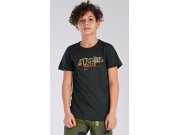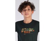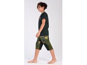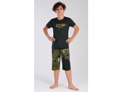 Dječja pamučna pidžama kapri Erik. Dječja pidžama sastoji se od majice s kratkim rukavima i tročetvrt hlača. Na jednobojnoj majici s okruglim izrezom nalazi se natpis 417 one route. Maskirne kapri hlače imaju u struku gumu i vezicu za stezanje, nemaju džepove. Korišteni pamučni materijal je ugodan i mekan na dodir, pidžama je pogodna i za svakodnevno nošenje.