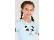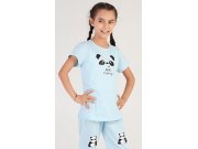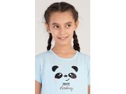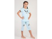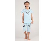 Dječja pamučna pidžama kapri Klara. Dječja pidžama sastoji se od majice s kratkim rukavima i tročetvrt hlača. Jednobojnu majicu krasi slika pande i mali natpis. Motiv pande ponavlja se i na hlačama. Korišteni pamučni materijal je ugodan i mekan na dodir.