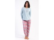 Ženska pamučna duga pidžama Charlotte. Ženska pidžama sastoji se od majice s dugim rukavima i dugih hlača. Jednobojnu majicu s okruglim izrezom na prsima krase leptirići. Karirane hlače imaju u struku gumu i vezicu za stezanje, nemaju džepove. Korišteni pamučni materijal je podatak i ugodan na dodir.