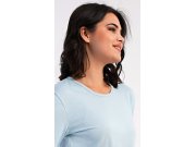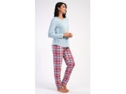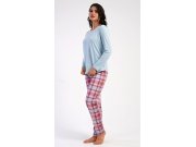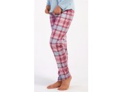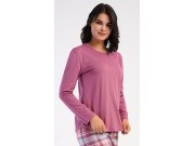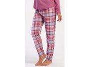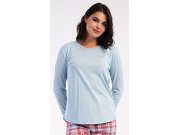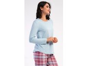 Ženska pamučna duga pidžama Dominica. Ženska pidžama sastoji se od majice s dugim rukavima i dugih hlača. Majica je jednobojna, bez printa, ima okrugli izrez. Karirane hlače imaju u struku gumu i vezicu za stezanje, nemaju džepove. Korišteni pamučni materijal je mekan i ugodan na dodir.