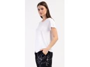 Ženska pidžama s kratkim rukavima Fiona. Ženska pidžama se sastoji od majice s kratkim rukavima i dugih hlača. Majica je jednobojna, bez otiska, ima okrugli izrez. Hlače s cvjetnim uzorkom imaju u struku gumu i vezicu za stezanje, nemaju džepove. Korišteni viskozni materijal je podatak i ugodan na dodir.