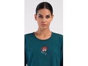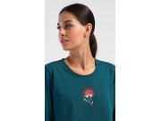 Ženska pamučna duga pidžama Jasmína. Ženska pidžama sastoji se od majice s dugim rukavima i dugih hlača. Majica je jednobojna, ukrašena slikom orijentalnog cvijeta. Ovaj motiv se ponavlja i na hlačama, koje u struku imaju gumu i vezicu za stezanje, nemaju džepove. Korišteni pamučni materijal je podatak i ugodan na dodir.