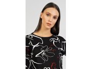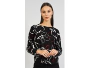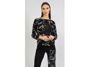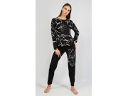 Duga ženska pamučna pidžama Lucie. Ženska pidžama sastoji se od majice s dugim rukavima i dugih hlača. Majica je crna s bijelim nepravilnim uzorkom. Hlače su jednobojne s crtežom tri leptira. Imaju gumu i vezicu za stezanje, nemaju džepove. Korišteni pamučni materijal je podatak i ugodan na dodir.