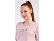 Ženska pamučna duga pidžama Morning. Ženska pidžama sastoji se od majice s dugim rukavima i dugih hlača. Majica je jednobojna, ukrašena slikom mačića i malim natpisom. Hlače imaju elastičnu traku i vezicu u struku, nemaju džepove. Korišteni pamučni materijal je mekan i ugodan na dodir.