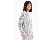 Duga ženska pidžama Sofia. Ženska pidžama sastoji se od majice s dugim rukavima i dugih hlača. Majica s okruglim izrezom ukrašena je apstraktnim uzorkom. Hlače imaju elastičnu traku u struku, vezicu za stezanje i praktične džepove. Završene su rubovima. Korišteni materijal je podatak i ugodan na dodir.