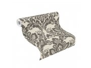 Flis tapeta sa zamkaškim damask uzorkom, tkaninska tekstura. Polusjajna podloga, uzorak u nijansi taupe / Siva-bežna.