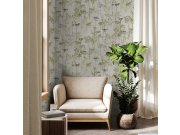 Flis tapeta s vinilnom površinom, bijela štuk podloga, motivi livadskih trava i listova u nijansama zelene i metalno zlatne.