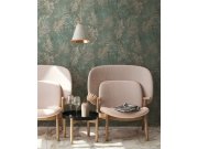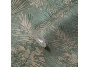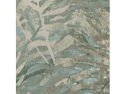 Okrovna flis tapeta za zid, motivi listova u nijansama tirkizne, sive, smeđe i bež. Tkaninska tekstura.