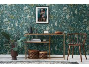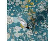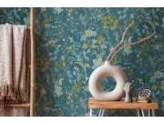 Tamno plava flis tapeta za zid, motivi cvjetova u zelenim, opečnato narančastim i žutim nijansama. Nježna grublja tekstura.