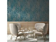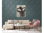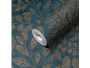 Plastična flis tapeta za zid, siva podloga, listovi plave, zelene i metalik boje.