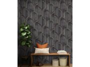 Flis tapeta s vinilnom površinom, crna štuk podloga, motivi livadskih trava i listova u nijansama smeđe, sive i metalik zlatno-smeđe.