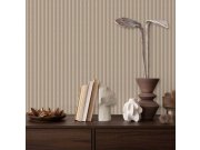 Tapeta sa vinilnom površinom, imitacija pletene prostirke, nijanse polusjajne braon boje sa srebrnim akcentima u prugama. Veličina role š. 106 cm x d. 1000 cm.