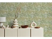 Flis tapeta s vinilnom površinom, grublja krem tekstura tkanine, motivi biljaka i listova u zelenim nijansama.