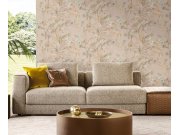 Luksuzna flis tapeta s vinilnom površinom, podloga grublje bež tkanine, bogat cvjetni uzorak u nježnim nijansama bež, smeđe, ljubičaste i žute boje.