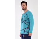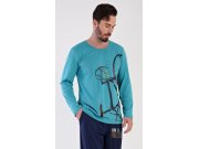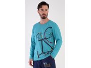 Muška pamučna duga pidžama Dominik. Muška pidžama se sastoji od majice s dugim rukavima i dugih hlača. Jednobojnu majicu krasi upečatljiva slika bicikla. Hlače imaju elastičnu traku u struku, vezicu za stezanje i praktične džepove. Korišteni materijal je ugodan i mekan na dodir. Udio pamuka u majici i hlačama je 100%.