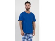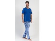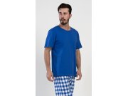 Muška pamučna duga pidžama Karel. Pidžama se sastoji od majice s kratkim rukavima i dugih hlača. Jednobojnu majicu prikladno nadopunjuju karirane hlače koje imaju gumu i vezicu za stezanje. Hlače nemaju džepove. Korišteni materijal s udjelom pamuka 100% je ugodan i mekan na dodir.