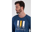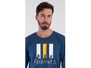 Muška pamučna duga pidžama Oliver. Muška pidžama sastoji se od majice s dugim rukavima i dugih hlača. Na jednobojnoj majici s okruglim izrezom nalazi se natpis PARAMORE, koji se ponavlja i na hlačama. Majicu ukrašavaju slike rock benda. Hlače imaju elastičnu traku u struku, vezicu za stezanje i praktične džepove. Korišteni materijal je mekan i ugodan na dodir. Udio pamuka u majici i hlačama je 100%.