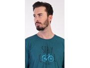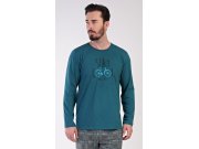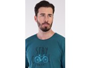 Muška pamučna pidžama duga Adam. Muška pidžama sastoji se od majice s dugim rukavima i dugih hlača. Jednobojna majica s okruglim izrezom ukrašena je slikom bicikla i natpisom Stay cool, young and free. Karirane hlače imaju u struku gumu i vezicu za stezanje. Nemaju džepove. Korišteni materijal je ugodan i mekan na dodir. Udio pamuka u hlačama i majici je 100%.