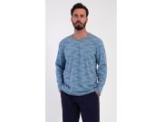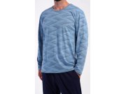 Muška duga pamučna pidžama Arnošt. Muška pidžama sastoji se od majice s dugim rukavima i dugih hlača. Majica s okruglim izrezom ima otisnut geometrijski uzorak. Jednobojne hlače imaju u struku gumu, vezicu za stezanje i praktične džepove. Korišteni materijal s udjelom pamuka 100% je podatna i ugodna na dodir.