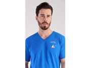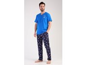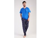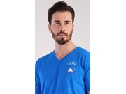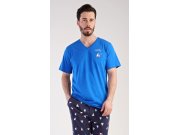 Muška pamučna duga pidžama s kratkim rukavima Brodić. Muška pidžama sastoji se od majice s kratkim rukavima i dugih hlača. Na plavoj majici s V-izrezom nalazi se mala slika brodića i natpis PACIFIC VOYAGE. Hlače s džepovima i printom brodića imaju u struku gumu i vezicu za stezanje. Korišteni materijal sa 100% udjelom pamuka je ugodan i mekan na dodir.