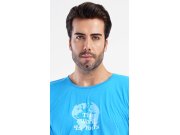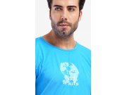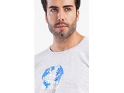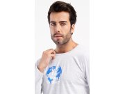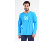 Muška duga pamučna pidžama Matěj. Muška pidžama sastoji se od majice s dugim rukavima i dugih hlača. Majica s okruglim izrezom je jednobojna, ukrašena na prsima slikom globusa i natpisom The world is yours. Jednobojne hlače imaju u struku gumu, vezicu za stezanje i praktične džepove. Korišteni materijal je podatak i ugodan na dodir. Sadržaj pamuka kod hlača i plave majice je 100%, dok je kod sive majice 70%.