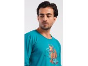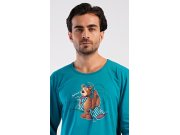 Muška duga pamučna pidžama Medo Pospanko. Muška pidžama sastoji se od majice s dugim rukavima i dugih hlača koje završavaju s rubovima. Majicu s okruglim izrezom na prsima krasi slika pospanog medvjeda. Jednobojne hlače imaju u struku gumu, vezicu za stezanje i praktične džepove. Korišteni materijal sa 100% udjelom pamuka je podatak i ugodan na dodir.