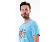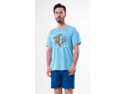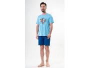 Muška pamučna pidžama kratke hlače Boss. Muška pidžama sastoji se od majice s kratkim rukavima i kratkih hlača. Na jednobojnoj majici s okruglim izrezom nalazi se slika medvjeda koji odmara u naslonjaču i natpis Im the Boss of my House. Majicu nadopunjuju jednobojne kratke hlače koje u struku imaju gumu i vezicu za stezanje. Nemaju džepove. Korišteni materijal je ugodan i mekan na dodir. Udio pamuka u majici i hlačama je 100%. Pidžama je pogodna i za svakodnevno nošenje.