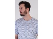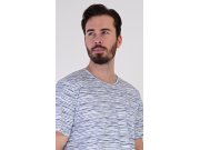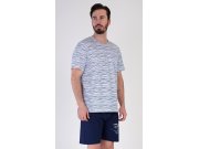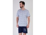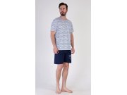 Muška pamučna pidžama kratke hlače Regata. Muška pidžama sastoji se od majice s okruglim izrezom i kratkih hlača. Majica s kratkim rukavima je na pruge. Dopunjuju je jednobojne hlače s motivom broda, koje u struku imaju gumu i vezicu za stezanje, nemaju džepove. Korišteni pamučni materijal je ugodan i mekan na dodir. Pidžama je pogodna i za svakodnevno nošenje.