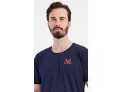 Muška pamučna pidžama s kratkim hlačama Rudolf. Muška pidžama sastoji se od majice s kratkim rukavima i kratkih hlača. Jednobojna majica s okruglim izrezom ima na prsima malu sliku raka i natpis DAILY FRESH. Isti motiv pojavljuje se i na hlačama, koje u struku imaju gumu, vezicu za stezanje i praktične džepove. Korišteni materijal sa 100% udjelom pamuka je ugodan i mekan na dodir.