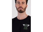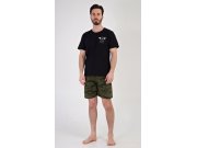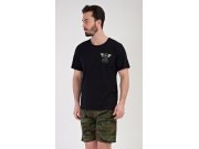 Muška pamučna pidžama šorc Air. Muška pidžama sastoji se od majice s kratkim rukavima i kratkih hlača. Crnu majicu s okruglim izrezom krasi manji natpis. Šorcevi s army uzorkom imaju u struku gumu i vezicu za stezanje. Kratke hlače nemaju džepove. Korišteni materijal s udjelom pamuka 100% je ugodan i mekan na dodir.