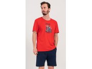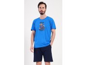 Muška pamučna pidžama sa šorcem Motociklist. Muška pidžama se sastoji od majice s kratkim rukavima i kratkih šorceva. Na jednobojnoj majici nalazi se slika medvjeda na motoru i natpis Motorcycle. Šorcevi imaju praktične džepove, u struku su s gumom i vezicom za stezanje. Korišteni materijal s udjelom pamuka 100% je ugodan i mekan na dodir. Pidžama je pogodna i za svakodnevno nošenje, a posebno ćete je cijeniti u vrućim ljetnim danima.