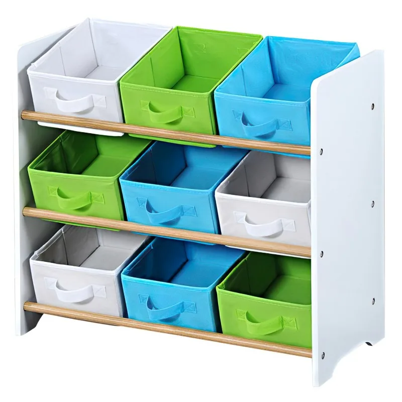Dosadno pospremanje igračaka može postati zabava, a igračke će uvijek imati svoje mjesto u dječjem regalu. Organizator je idealan za pohranu igračaka i sadrži 9 platnenih kutija u tri različite boje, prilagođenih djeci za jednostavno spremanje. Svaka kutija opremljena je praktičnim držačem koji olakšava umetanje i vađenje. Blagi nagib polica omogućava djeci bolji pregled spremljenih dragocjenosti.