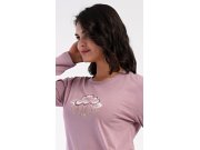 Ženska pamučna duga pidžama Amelia. Ženska pidžama sastoji se od majice s dugim rukavima i dugih hlača. Jednobojnu majicu s okruglim izrezom krasi slika oblaka. Ovaj motiv se ponavlja i na hlačama, koje u struku imaju gumu i vezicu za stezanje, nemaju džepove. Korišteni pamučni materijal je podatljiv i ugodan na dodir.