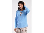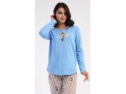 Ženska pamučna duga pidžama Bear. Ženska pidžama sastoji se od majice s dugim rukavima i dugih hlača. Jednobojna majica ukrašena je slikom medvjeda. Ovaj motiv se ponavlja i na prugastim hlačama koje u struku imaju gumu i vezicu za stezanje, nemaju džepove. Korišteni pamučni materijal je mekan i ugodan na dodir.