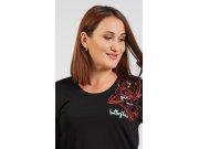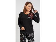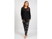 Ženska pamučna duga pidžama Butterfly. Ženska duga pidžama sastoji se od majice s dugim rukavima i dugih hlača. Na jednobojnoj crnoj majici nalazi se otisak crvenih leptira i bijeli natpis. Hlače imaju u struku gumu i vezicu za stezanje, bez džepova su. Korišteni pamučni materijal je ugodan i mekan na dodir.