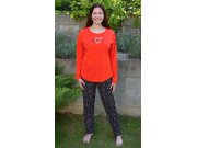 Ženska pamučna duga pidžama Forever. Ženska duga pidžama Forever sastoji se od majice s dugim rukavima i dugih hlača. Na jednobojnoj majici nalazi se natpis FOREVER i slika srca, a isti motiv se ponavlja i na dugim hlačama. Hlače imaju gumu i vezicu za stezanje, nemaju džepove. Korišteni pamučni materijal je podatak i ugodan na dodir.