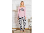 Ženska pamučna duga pidžama Good vibes. Pidžama se sastoji od majice s dugim rukavima i dugih hlača. Na majici je veliki natpis Good Vibes only, koji upotpunjuje slika slatke male pande. Motiv pande se ponavlja i na hlačama, koje u struku imaju gumu i vezicu za stezanje. Pidžama hlače nemaju džepove. Korišteni pamučni materijal je ugodan i mekan na dodir.