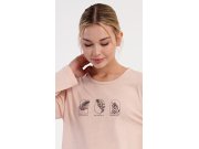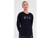 Ženska pamučna duga pidžama Isabela. Ženska pidžama sastoji se od majice s dugim rukavima i dugih hlača. Majica s V-izrezom ukrašena je na prsima slikama grančica i malim natpisom. Motiv grančica ponavlja se i na hlačama, koje u struku imaju gumu i vezicu za stezanje, nemaju džepove. Korišteni pamučni materijal je podatljiv i ugodan na dodir.