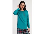 Ženska pamučna duga pidžama Love. Ženska pidžama sastoji se od majice s dugim rukavima i dugih hlača. Majica je jednobojna, ukrašena natpisom LOVE. Karirane hlače imaju u struku gumu i vezicu za stezanje, nemaju džepove. Korišteni pamučni materijal je podatak i ugodan na dodir.
