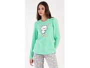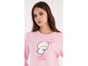 Ženska duga flis pidžama Mačić. Ženska pidžama sastoji se od majice s dugim rukavima i dugih hlača. Majica je ukrašena aplikacijom - slikom mačića i natpisom SWEET DREAMS. Flis materijal je topao i mekan na dodir. Hlače s uzorkom su na gumu, imaju vezicu za stezanje i praktične džepove, također su izrađene od flisa. Ova pidžama je zbog topline pogodna i kao kućna odjeća za hladne dane.