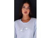 Ženska pamučna duga pidžama Nature. Ženska pidžama sastoji se od majice s dugim rukavima i dugih hlača. Majica je jednobojna, ukrašena slikom s cvjetnim motivom. Cvjetni uzorak se ponavlja i na hlačama, koje u struku imaju gumu i vezicu za stezanje, nemaju džepove. Korišteni pamučni materijal je podatak i ugodan na dodir.