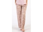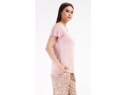 Ženska pidžama s kratkim rukavima Olga. Ženska pidžama se sastoji od majice s kratkim rukavima i dugih hlača. Majica je jednobojna, bez tiska, ima okrugli izrez. Hlače s orientalističkim uzorcima imaju elastičnu traku u struku i vezicu za stezanje, nemaju džepove. Korišteni viskozni materijal je podatljiv i ugodan na dodir.